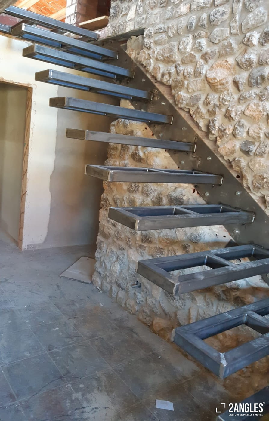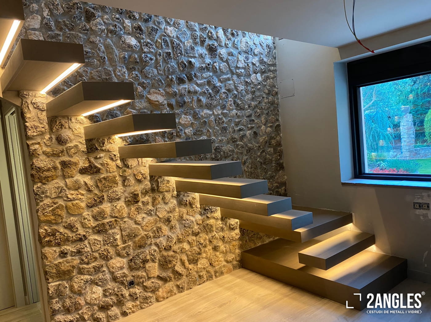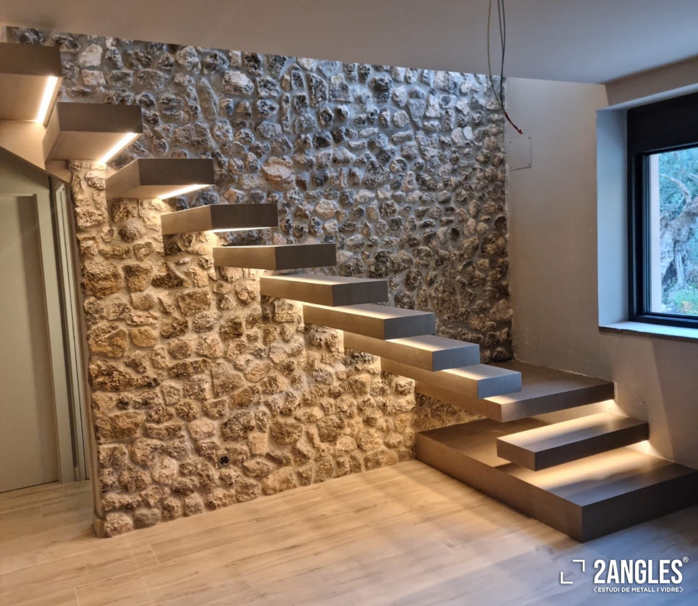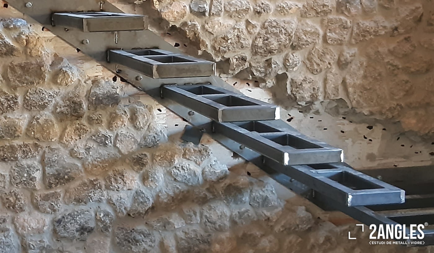 L’estructura metàl·lica, dissenyada i fabricada a mida, garanteix l’estabilitat i la seguretat del conjunt, mentre que el revestiment de fusta aporta calidesa i equilibri material. El resultat és una escala que combina precisió tècnica i disseny, integrant-se de manera natural en un entorn marcat per la presència de la pedra i la llum.